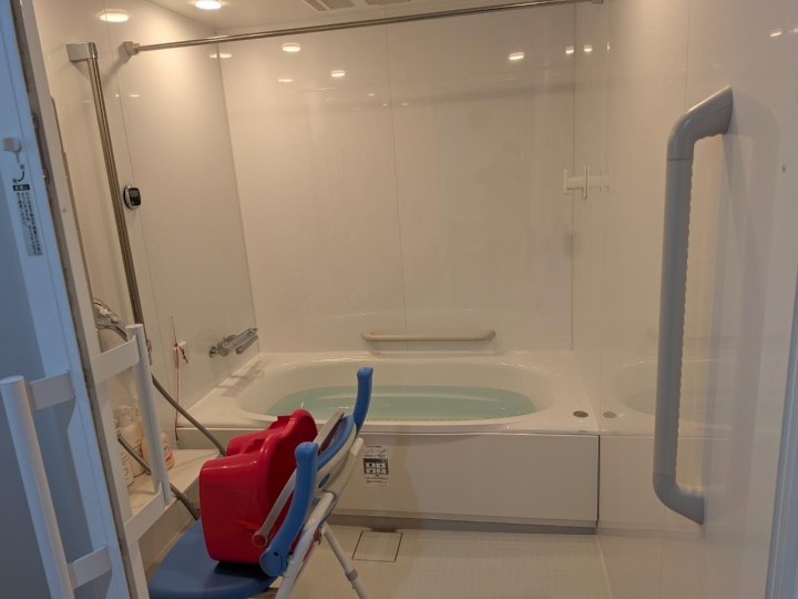 清潔保持やリラックスを目的として、必要な方に個浴で対応しています。浴室には、身体への負担を抑えられる介護専門のLIXIL製ボディーハグシャワーを設置し、シャワー浴を中心とした入浴方法もご案内しています。体調やその日のご様子を見ながら、無理のない入浴方法を選択・ご利用いただけるよう配慮しています。